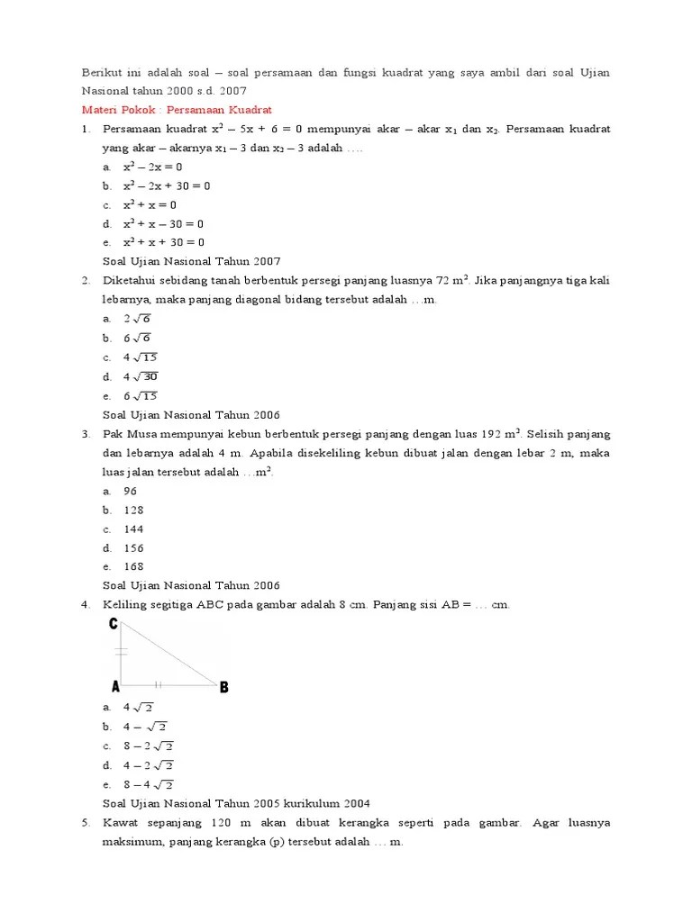Apr 13, 2020 · secara umum, persamaan kuadrat dibagi menjadi empat, yaitu sebagai berikut. Umumnya, materi ini dipelajari setelah siswa memahami konsep mengenai persamaan kuadrat, karena selain melibatkan perhitungan secara aljabar, materi ini juga melibatkan analisis secara geometri (gambar grafik). Fungsi kuadrat adalah fungsi yang pada persamaannya memiliki variabel dengan pangkat tertingginya 2. Oct 12, 2020 · soal dan jawaban latihan 2.1 persamaan kuadrat, matematika kelas 9. Aug 15, 2021 · guru sd smp sma soal persamaan dan fungsi kuadrat smp kelas 9.
