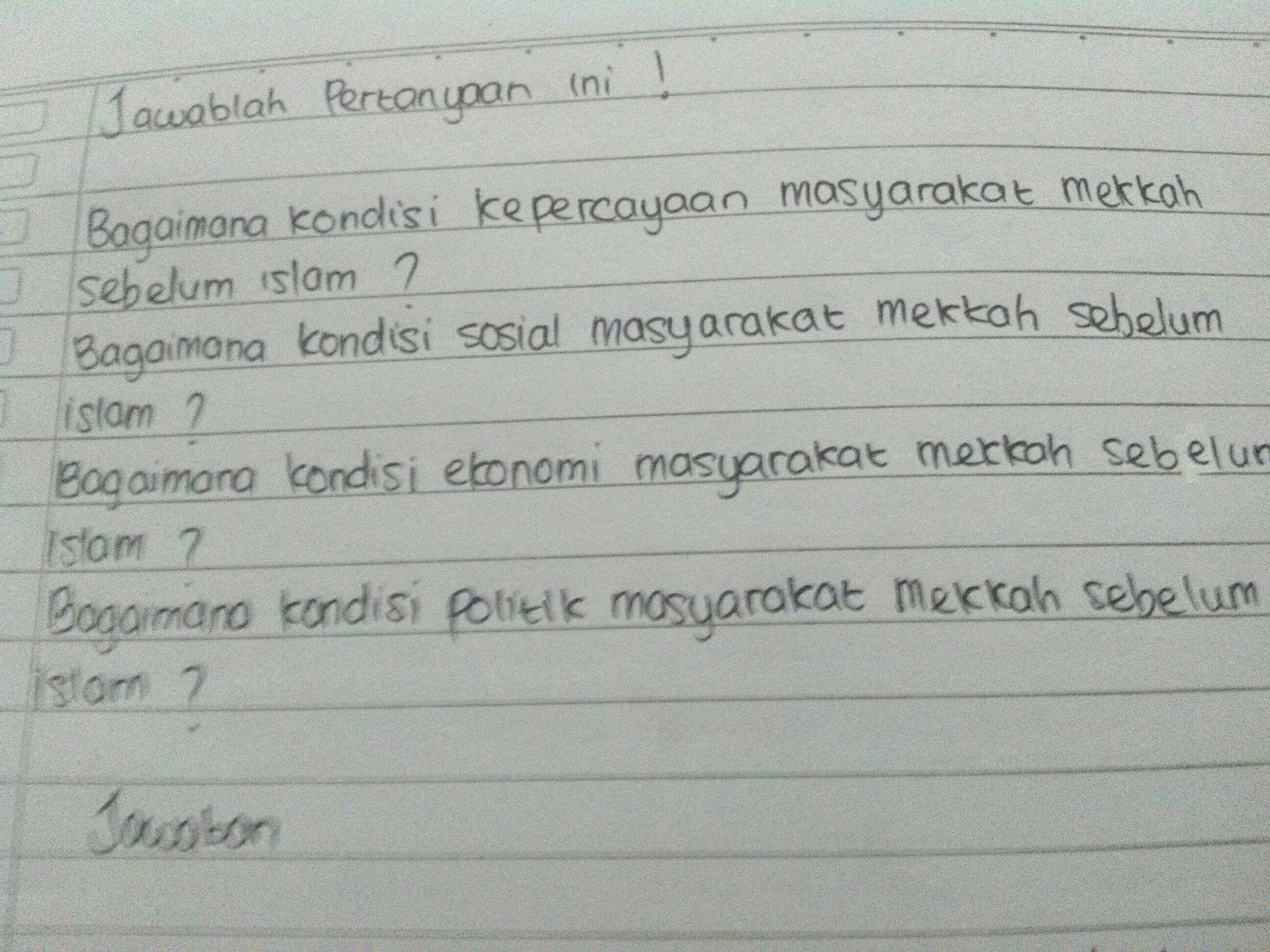 Kondisi masyarakat mekkah sebelum islam (ski kelas 7). Adanya kebutuhan terhadap tuhan yang selalu bersama mereka terutama saat mereka membutuhkan. Dengan kondisi sosial dan kepercayaan masyarakat mekkah sebelum islam. Bagaimana kondisi kepercayaan masyarakat mekkah sebelum islam? Bagaimana kondisi sosial masyarakat mekkah sebelum islam?3. Kepercayaan masyarakat arab sebelum islam · penghormatan atau pengagungan yang berlebihan terhadap leluhur atau kepala suku mereka yang telah berjasa dikaumnya . Dan mulailah kepercayaan baru masuk ke masyarakat mekkah dan kota mekkah menjadi pusat penyembahan berhala. 1.bagaimana kondisi kepercayaan masyarakat mekkah sebelum islam?2. ▫ melalui think pair share, peserta didik mengajukan pertanyaan tentang apa yang . Kondisi sosial masyarakat mekkah sebelum islam adalah * masyarakat suku quraish di mekah kebanyakan hidup sebagai pedagang * kaum quraish banyak menyembah . Mereka menyembah berhala dan tidak mengenal tuhan, allah swt. Kondisi kepercayaan masyarakat makkah sebelum islam · 1. Ketika melaksanakan haji, bangsa arab melihat .