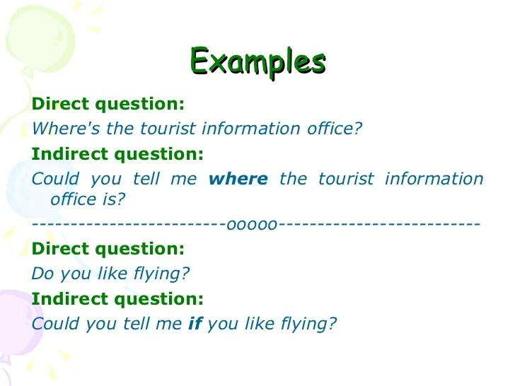 Contoh Direct And Indirect Speech : Indirect Questions - online presentation : Mother said that she had bought the book the previous night.. Berikut adalah 14 contoh kalimat imperative pada direct and indirect speech. I, we, me, us, mine, or our perubahannya tergantung pada pronoun dari reporting verb. Direct and indirect speech is devided into 3 types namely : Direct & indirect speech ( kalimat langsung dan tak langsung ), yang juga di kenal dengan reported speech akan di bahas secara . Suatu kalimat pernyataan yang terdapat pada indirect speech umummnya menggunakan kata that.